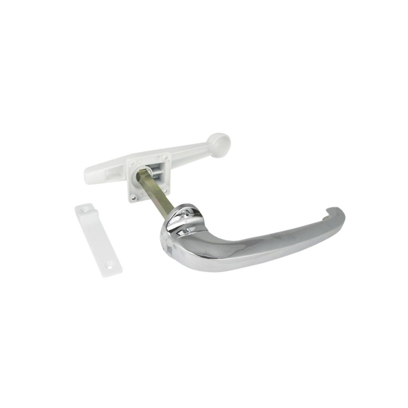 Cierre de presión con un punto de cierre, para puertas frigoríficas o puertas acústicas en todo tipo de cámaras. Perfecta estanqueidad de cámara sea frigorífica o acústica. Para puertas encastradas. Fácil instalación. Lleva un cuadradillo que es la conexión entre la maneta interior y la exterior que se puede cortar para los diferentes tipos de espesores de puerta hasta un máximo de 120mm. Maneta exterior y base en zamak 5 cromado brillo. Maneta interior y base en aluminio epoxi blanco. Nariz en poliamida 6.6. Cuadradillo de acero cincado-Intercambiable derecha/izquierda. 6 Tornillos de Ø5mm.