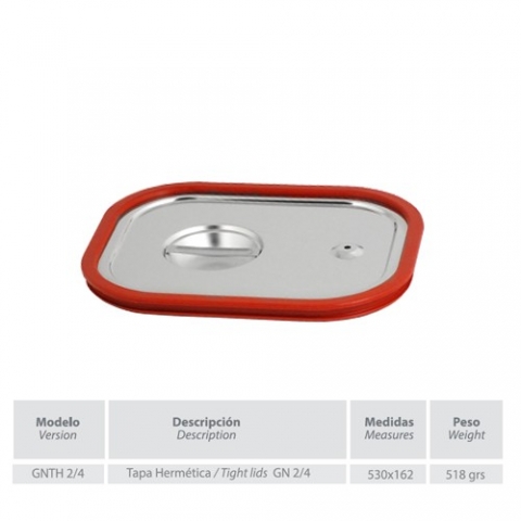 Tapa hermética para cubetas GASTRONORM GN-2/4 - 530x162mm. fabricada en acero inoxidable AISI 304.