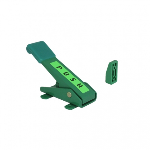 Cierre para cámara frigorífica con 1 punto de cierre exterior. Modelos: G-200C cromado y G-200P pintado gris con o sin maneta interior. Intercambiable derecha/ izquierda. Materiales y acabados: Caja: Zamak 5 cromado brillo / Pintado gris (A). Maneta: P.A. 6.6 con 30% FV. Nariz: Aluminio epoxi negro regulable 10mm. Maneta interior: Epoxi verde (B). Tope: Poliamida 6.6 (E). 12 tornillos: 10 Ø6mm. y 2 Ø5mm. (No incluidos). Fuerza de cierre: 30kg.
