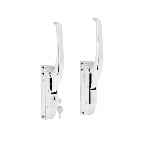 Cierre con maneta curva para puerta de cámara modelos 691(sin cerradura) - 696 (con cerradura). Para puerta frigorífica o neutra de mueble para frio comercial. Cierre y nariz con caja y maneta en zamak 5 cromado brillo con mango curvo. Fuerza de cierre de 15 Kg.