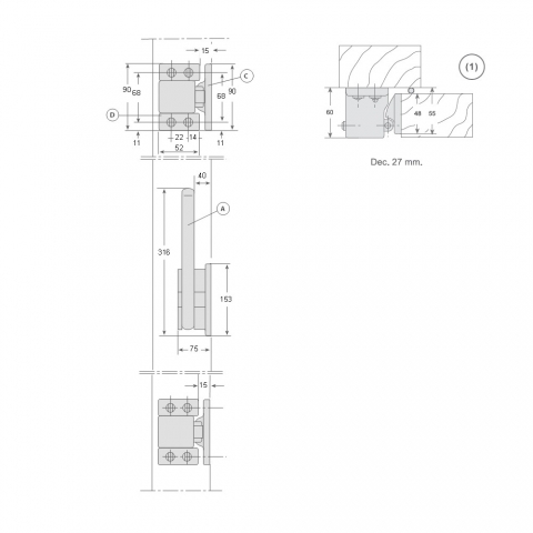 Máxima durabilidad en todo tipo de ambientes, desde el más ácido al más básico. Exterior en zamak 5 cromo brillo (D-C), maneta exterior (A) inoxidable AISI 304 y maneta interior (B) en composite color verde según normativa. Pasadores y muelles en acero cincado de 15 micras para minimizar una oxidación temprana. Topes poliamida 6.6 (E). Tornillos: 18 de Ø6mm. y 8 de Ø5mm. Suplemento altura 11, 19 y 23mm.