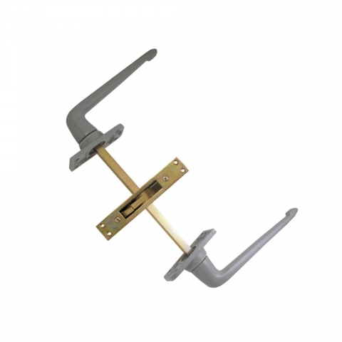 Cierre de presión con excéntrica para puertas de hornos, incubadoras, acústicas o frigoríficas. El cierre está formado por dos manetas de zamak pintado epoxi, una caja con el mecanismo excéntrico y un registro para el marco de puerta. Los materiales de fabricación son acero cincado y zamak pintado epoxi. Materiales y acabados: maneta y base en aluminio. Casquillos en delrin 100. Caja y mecanismos en acero zincado. Excéntrica en latón zincado. 12 tornillos Ø5mm. (No incluidos). Indicar mano.