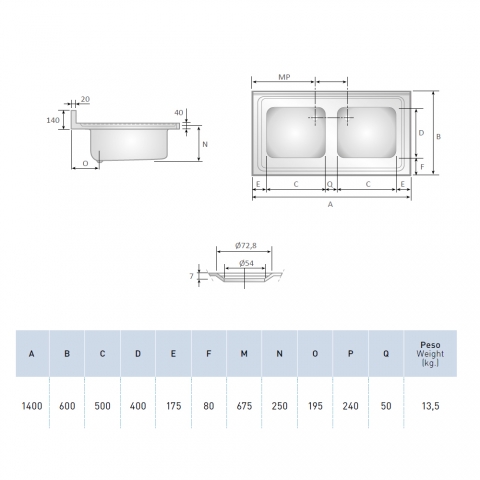 Doble fregadero modelo 14600-2, sin escurridor fabricado en acero inoxidable AISI 304 con acabado electropulido y desagüe incorporado 1” 1/2. Medidas totales: 1400 x 1600 x 250 mm. Consultar plano para medidas detalladas.