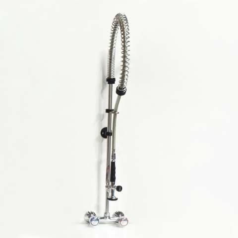 Equipo ducha completo. Grifo pomo de 2 aguas para pared. Pomo doble, piña ducha y tubo central en latón cromo. Muelle balanceo de acero cincado. Latiguillo malla/ goma. Sujeción a pared y gancho fabricados en zamak. Su pomo de 2 aguas permite un control preciso de la temperatura y el flujo de agua, mientras que su instalación en la pared maximiza el espacio disponible en tu cocina.